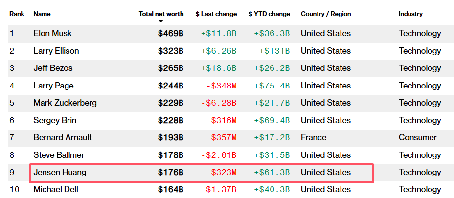 随着英伟达股价的飙升,公司CEO黄仁勋的身家也随之暴涨,据彭博亿万富翁指数显示,其净资产目前已达到1760亿美元。仅今年一年,他的财富就增长了超过600亿美元,足以让他跻身全球十大富豪之列。根据10月份提交给美国证券交易委员会的文件显示,黄仁勋以个人名义和家族信托持有该公司约3.5%的股份。