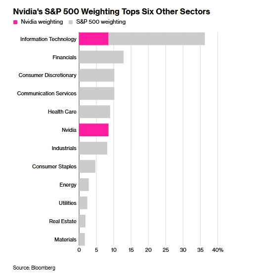 英伟达在标普500指数中的权重甚至超过了总计11个行业板块中的六个: