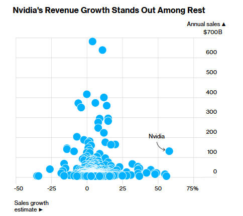 随着企业规模扩大,其销售增长率往往会放缓,因为基数也随之变得更大——目前,预计销售额达到或超过1000亿美元的标普500指数成分股公司的平均年收入增长率为6%。然而,英伟达在这项统计中依然属于异数——其本财年的营收预计将增长近60%。