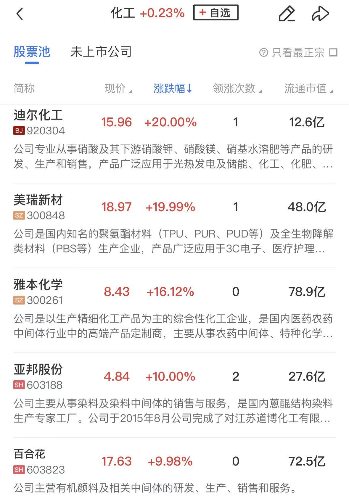 化工板块盘中走强,芳香胺方向领涨,美瑞新材、百合花涨停,建新股份、华尔泰、信凯科技、雅本化学、广康生化涨超5%。消息面上,据《科创板日报》11月1日消息,国科大张夏恒研究团队开发出一种直接脱氨的全新策略。该策略能够将芳香胺中稳定的碳氮键替换为功能各异的多种重要化学键。使用实验室中常见且价格低廉的试剂,即可轻松实现公斤级的规模化合成。