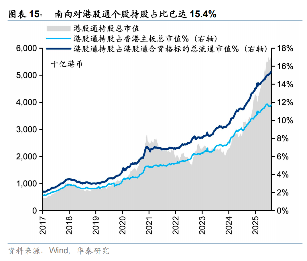 南向资金:2025年创纪录流入超万亿港币后,2026年流入规模预计将放缓至7500-9800亿港币(较今年下降约20%-40%)。主动偏股型公募基金的港股配置比例已接近合理水平,增量空间有限,后续动力主要来自保险、被动资金等。
