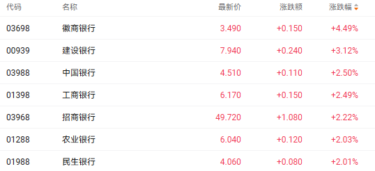 截至收盘,建设银行(00939.HK)、工商银行(01398.HK)、招商银行(03968.HK)收盘分别上涨3.12%、2.49%、2.22%。