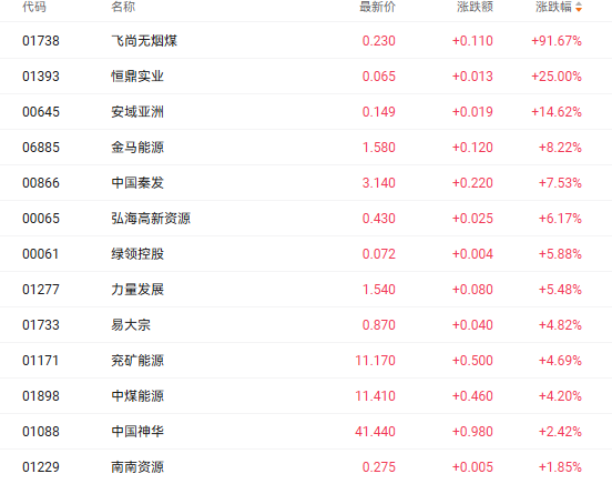 截至收盘,中国秦发(00866.HK)、兖矿能源(01171.HK)、中煤能源(01898.HK)分别上涨7.53%、4.69%、4.20%。