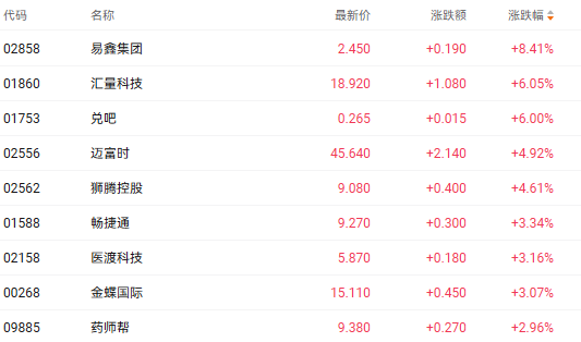 截至收盘,汇量科技(01860.HK)、迈富时(02556.HK)、金蝶国际(00268.HK)分别上涨6.05%、4.92%、3.07%。