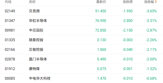 截至收盘,华虹半导体(01347.HK)、中芯国际(00981.HK)、芯智控股(02166.HK)分别下跌3.51%、2.87%、2.11%。