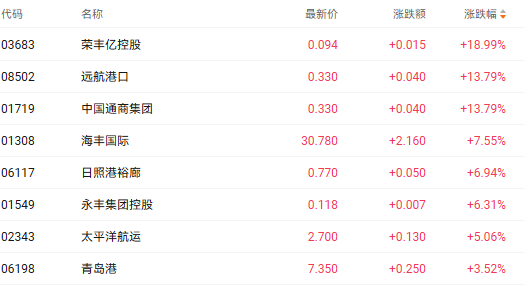 截至收盘,海丰国际(01308.HK)、太平洋航运(02343.HK)、青岛港(06198.HK)分别上涨7.55%、5.06%、3.52%。