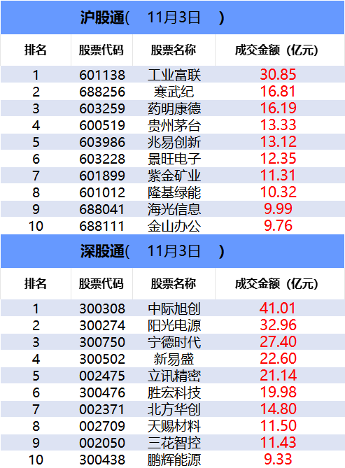 从沪股通前十大成交个股来看,工业富联位居首位;寒武纪和药明康德分居二、三位。