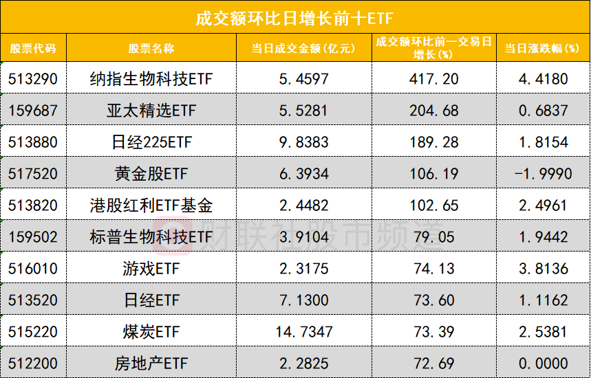 从成交额环比增长前十的ETF来看,纳指生物科技ETF(513290)成交额环比增长417%位居首位;亚太精选ETF(159687)成交额环比增长204%位居次席。