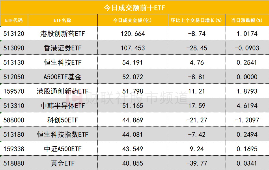 从成交额前十的ETF来看,港股创新药ETF(513120)成交额位居首位,香港证券ETF(513090)成交额位居次席。