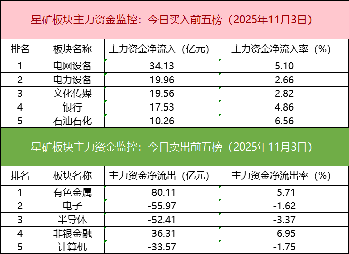 从主力板块资金监控数据来看,电网设备板块主力资金净流入居首。