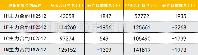 四大期指主力合约中,IH、IF、IM合约多空双方均减仓,IF合约空头减仓数量较多。