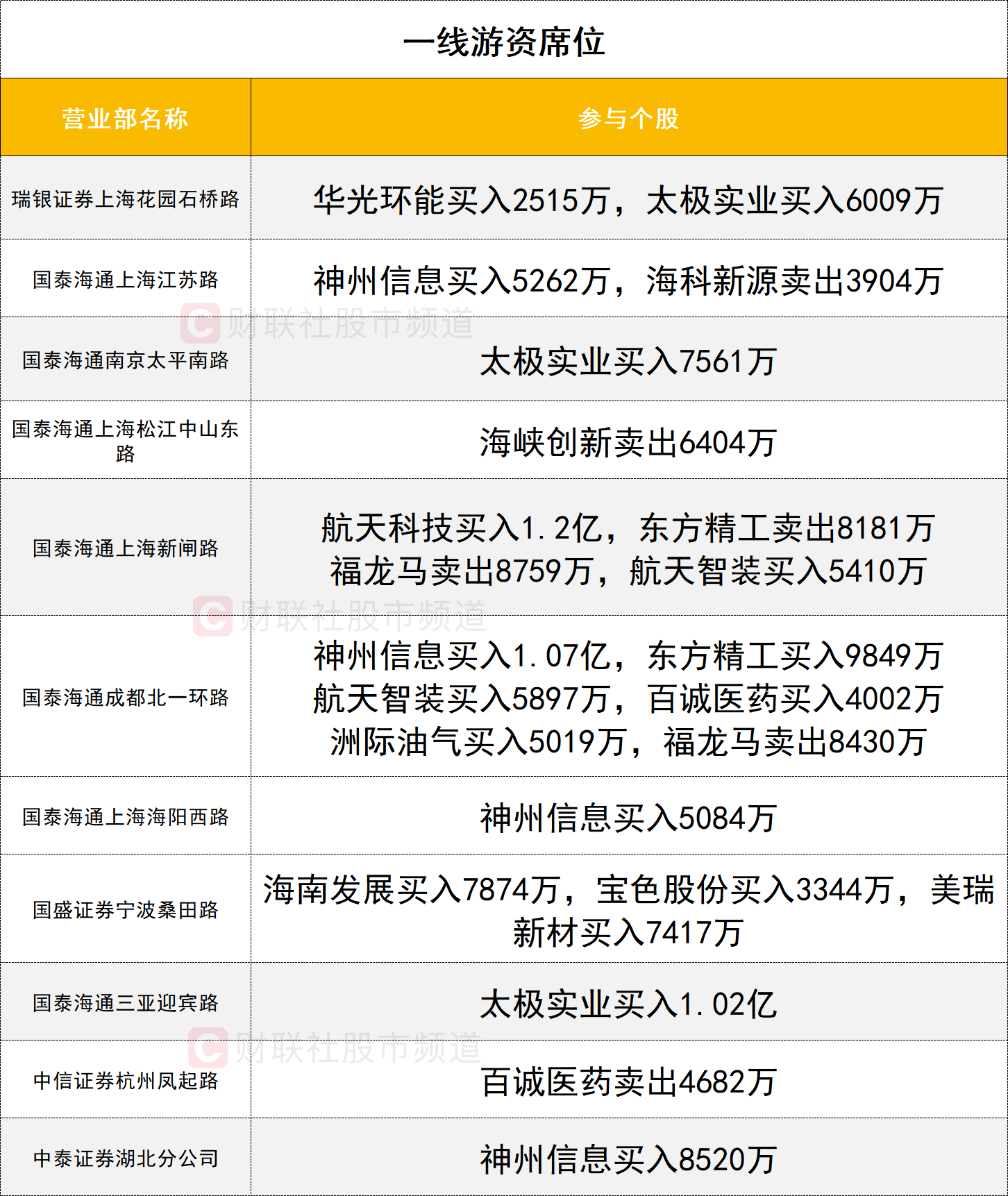 一线游资活跃度有所降低,航天智装获两家一线游资席位(国泰海通证券成都北一环路、国泰海通证券上海新闸路)分别买入5897万、5410万。太极实业获三家一线游资席位合计买入2.3亿。