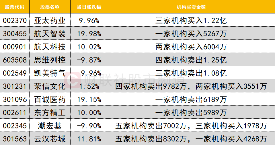 卖出方面,凯美特气今日跌停,遭三家机构卖出1.08亿。荣信文化遭四家机构卖出9782万,同时获两家机构买入3551万。