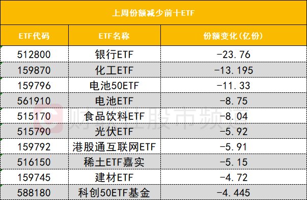 在上周份额减少前十的ETF中,两只电池相关ETF份额大幅减少,其中电池50ETF(159796)上周份额减少11.33亿份。