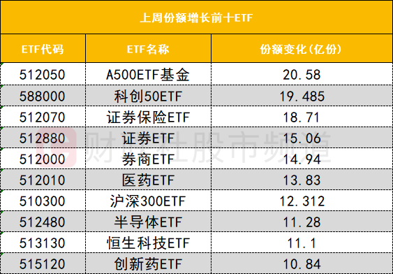 在上周份额增长前十ETF中,A500ETF基金上周份额增长20.58亿份位居首位;科创50ETF(588000)上周份额增长19.485亿份位居次席。