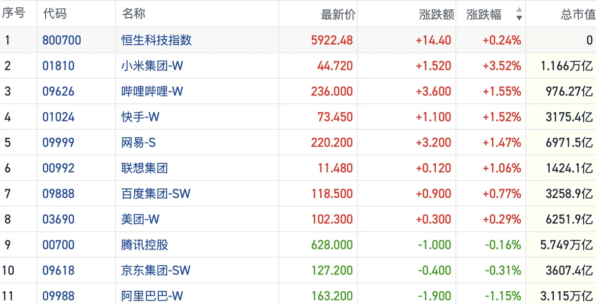 盘面上,今日大型科网股涨跌不一,其中,小米涨3.5%,百度、美团飘红,阿里巴巴跌超1%,京东、腾讯小幅下跌。