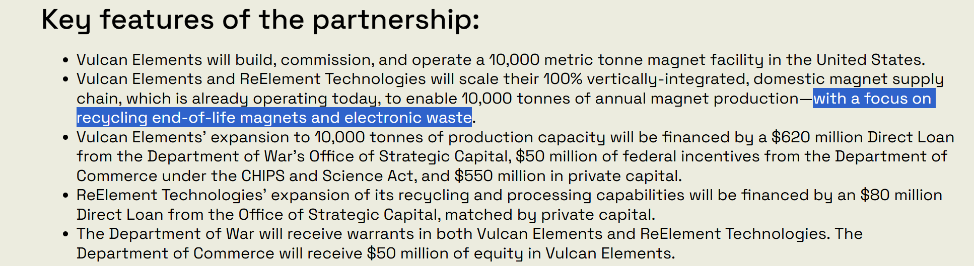 众所周知,美国并不具备大规模提炼稀土的产能。Vulcan Elements的应对之策就是从电子垃圾中寻找原材料。公司在公告中强调,实现万吨产能的重点是“回收报废磁体和电子废弃物”(focus on recycling end-of-life magnets and electronic waste)。
