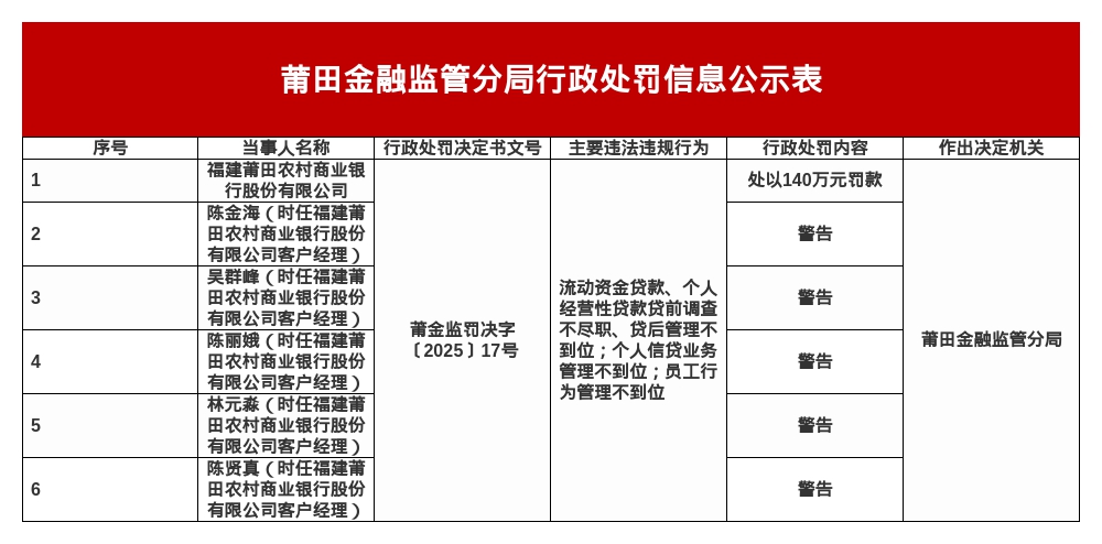 针对上述违法违规行为,国家金融监督管理总局莆田监管分局对福建莆田农商行罚款140万元;对陈金海、吴群峰、陈丽娥、林元淼、陈贤真等5人给予警告。