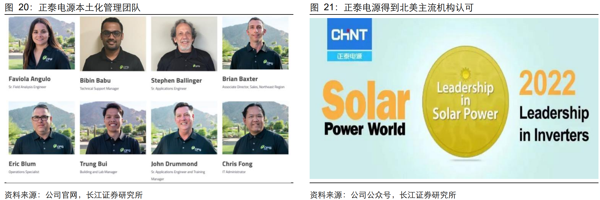 通润装备成立于2002年,传统主业为金属制品,收购正泰电源后切入新能源领域。正泰电源2011年正式进入北美市场,以独特的产品设计理念叠加多年售后服务提升客户粘性。子公司CPS为美国本土化销售公司,管理团队多数来自美国电力类企业,市场接纳度高。