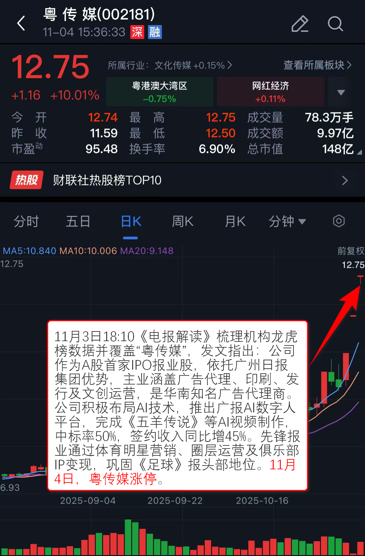 11月3日18:10《电报解读》梳理机构龙虎榜数据并覆盖“粤传媒”,发文指出:公司作为A股首家IPO报业股,依托广州日报集团优势,主业涵盖广告代理、印刷、发行及文创运营,是华南知名广告代理商。公司积极布局AI技术,推出广报AI数字人平台,完成《五羊传说》等AI视频制作,中标率50%,签约收入同比增45%。先锋报业通过体育明星营销、圈层运营及俱乐部IP变现,巩固《足球》报头部地位。11月4日,粤传媒涨停。