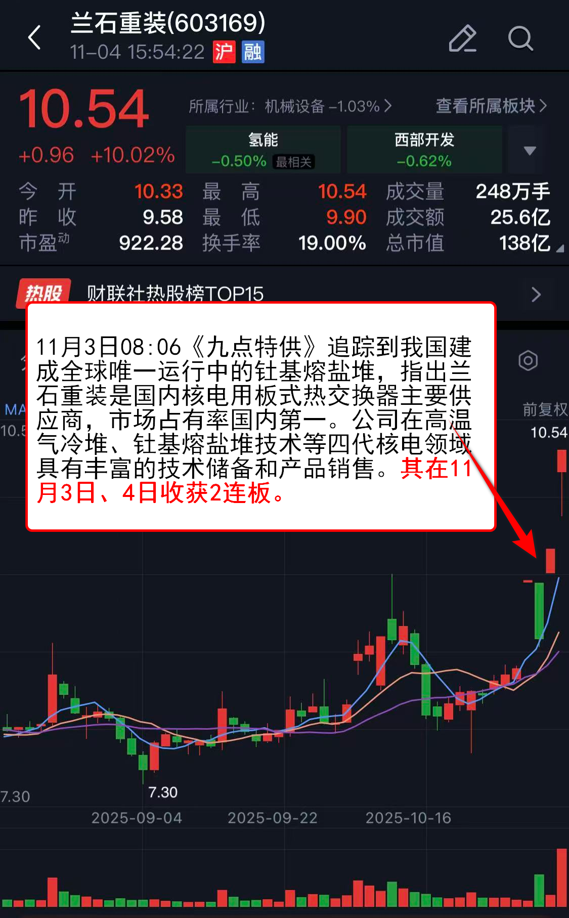 11月3日08:06《九点特供》追踪到我国建成全球唯一运行中的钍基熔盐堆,指出兰石重装是国内核电用板式热交换器主要供应商,市场占有率国内第一。公司在高温气冷堆、钍基熔盐堆技术等四代核电领域具有丰富的技术储备和产品销售。其在11月3日、4日收获2连板。