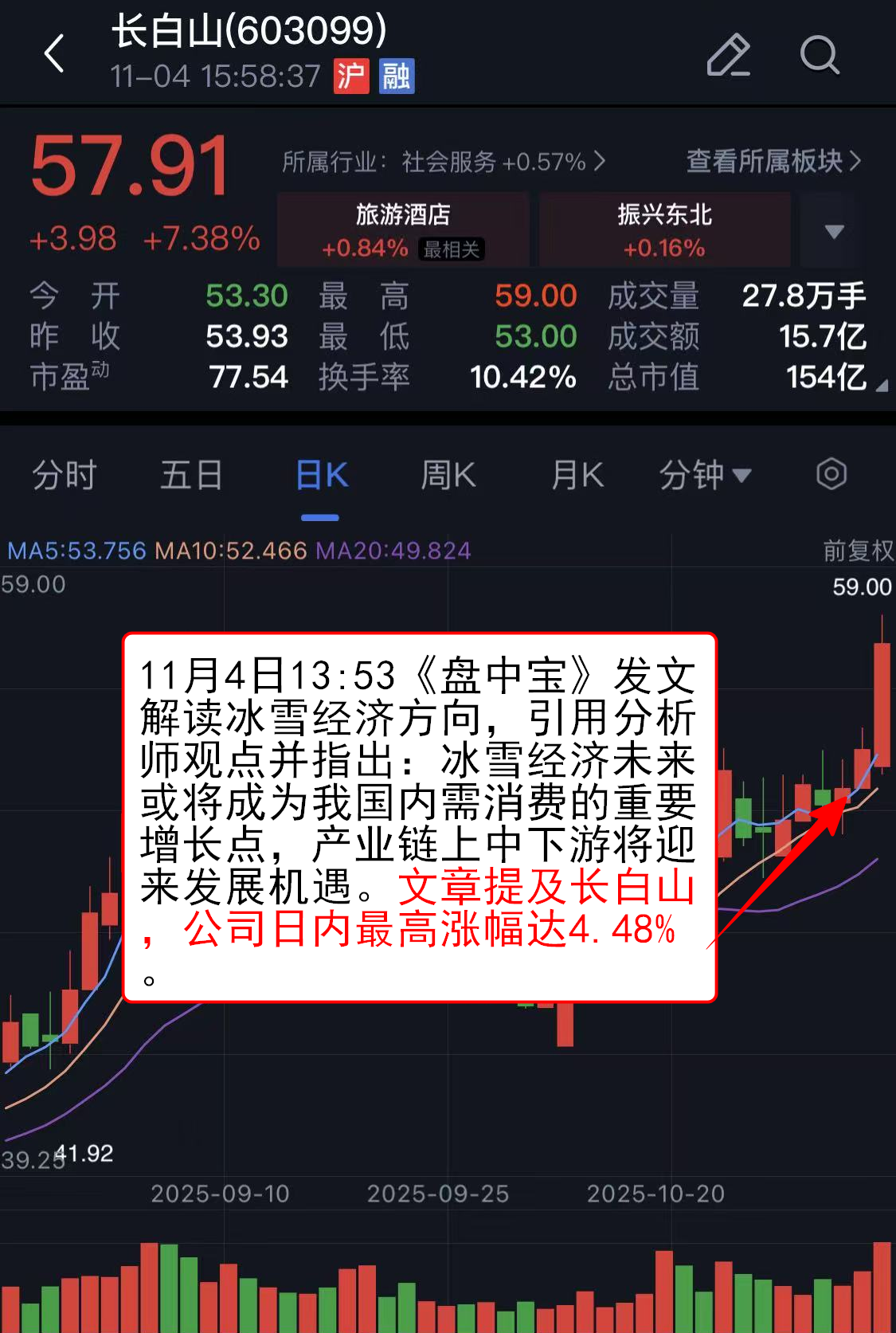11月4日13:53《盘中宝》发文解读冰雪经济方向,引用分析师观点并指出:冰雪经济未来或将成为我国内需消费的重要增长点,产业链上中下游将迎来发展机遇。文章提及长白山,公司日内最高涨幅达4.48%。