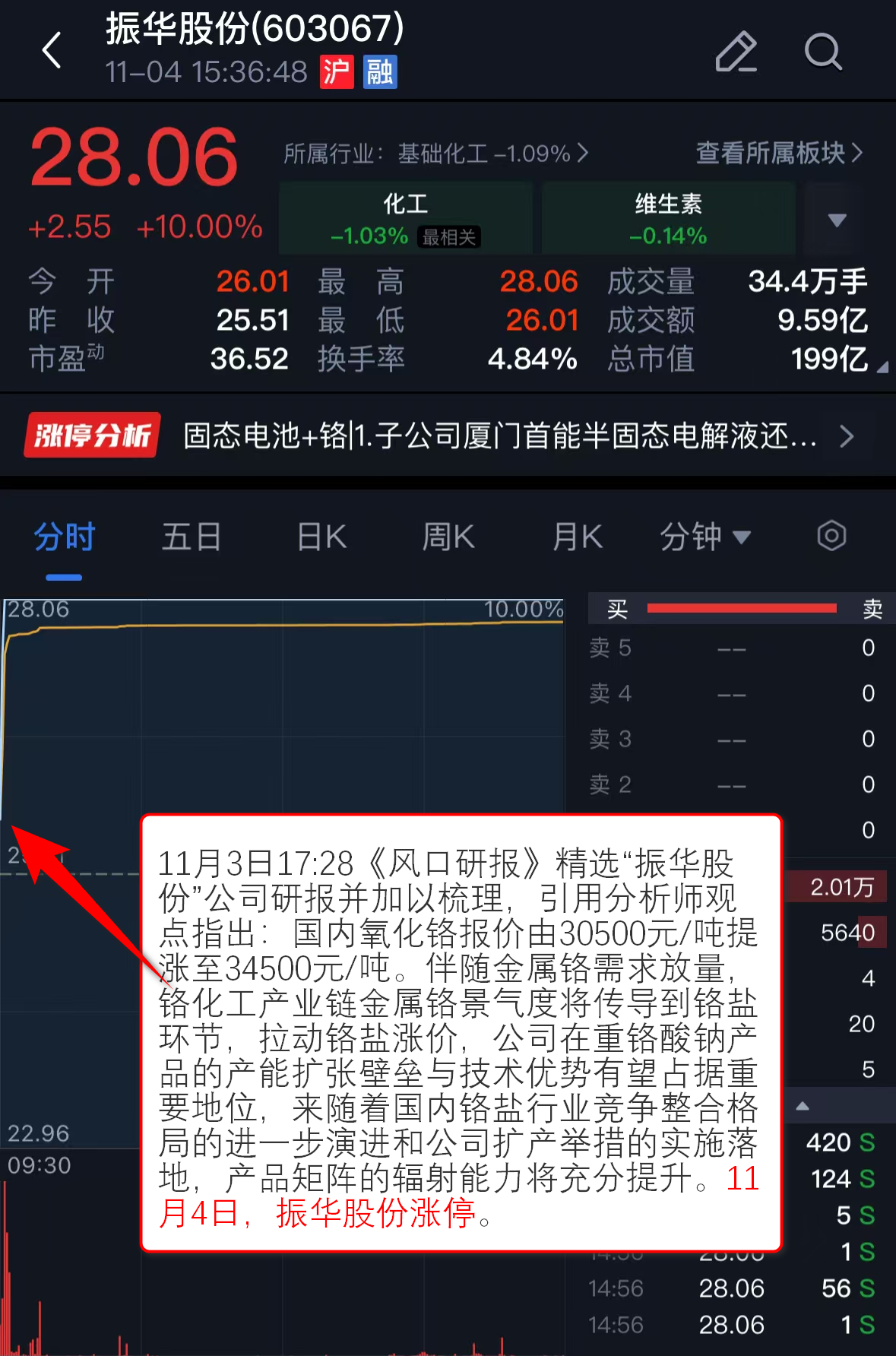 11月3日17:28《风口研报》精选“振华股份”公司研报并加以梳理,引用分析师观点指出:国内氧化铬报价由30500元/吨提涨至34500元/吨。伴随金属铬需求放量,铬化工产业链金属铬景气度将传导到铬盐环节,拉动铬盐涨价,公司在重铬酸钠产品的产能扩张壁垒与技术优势有望占据重要地位,来随着国内铬盐行业竞争整合格局的进一步演进和公司扩产举措的实施落地,产品矩阵的辐射能力将充分提升。11月4日,振华股份涨停。