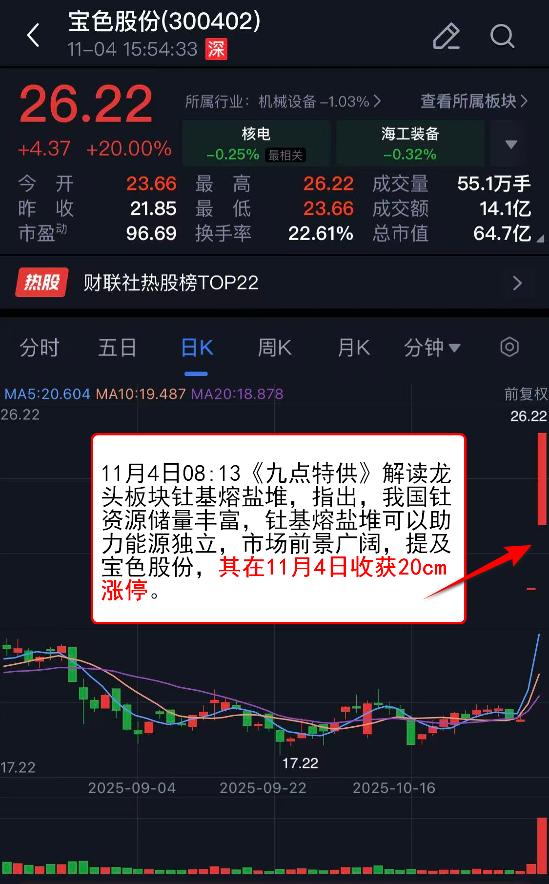 11月4日08:13《九点特供》解读龙头板块钍基熔盐堆,指出,我国钍资源储量丰富,钍基熔盐堆可以助力能源独立,市场前景广阔,提及宝色股份,其在11月4日收获20cm涨停。