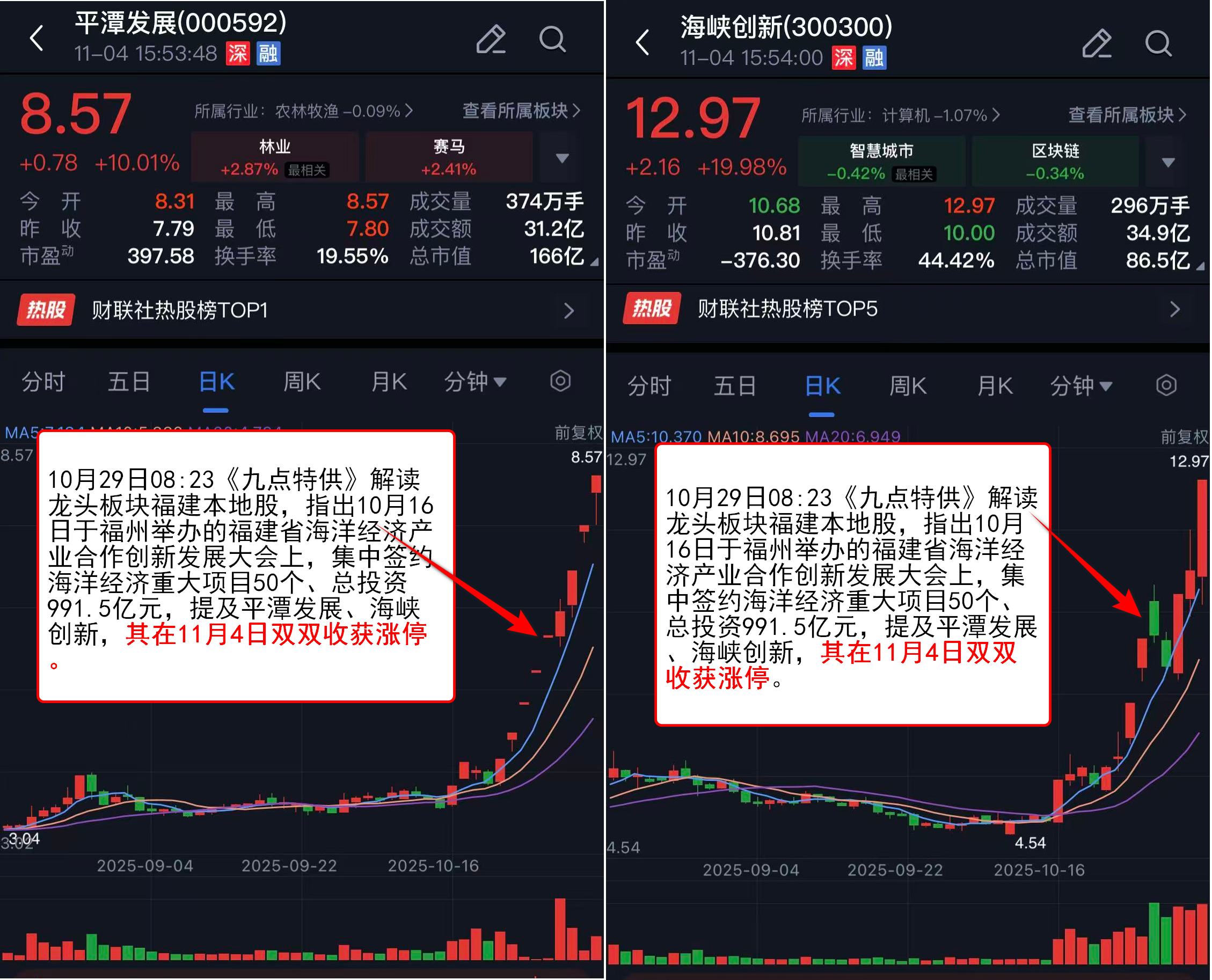 10月29日08:23《九点特供》解读龙头板块福建本地股,指出10月16日于福州举办的福建省海洋经济产业合作创新发展大会上,集中签约海洋经济重大项目50个、总投资991.5亿元,提及平潭发展、海峡创新,其在11月4日双双收获涨停。