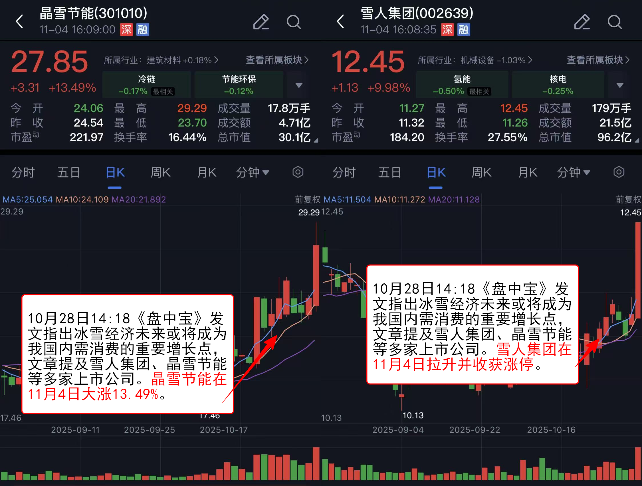 10月28日14:18《盘中宝》发文指出冰雪经济未来或将成为我国内需消费的重要增长点,文章提及雪人集团、晶雪节能等多家上市公司。雪人集团在11月4日拉升并收获涨停,晶雪节能在11月4日大涨13.49%。