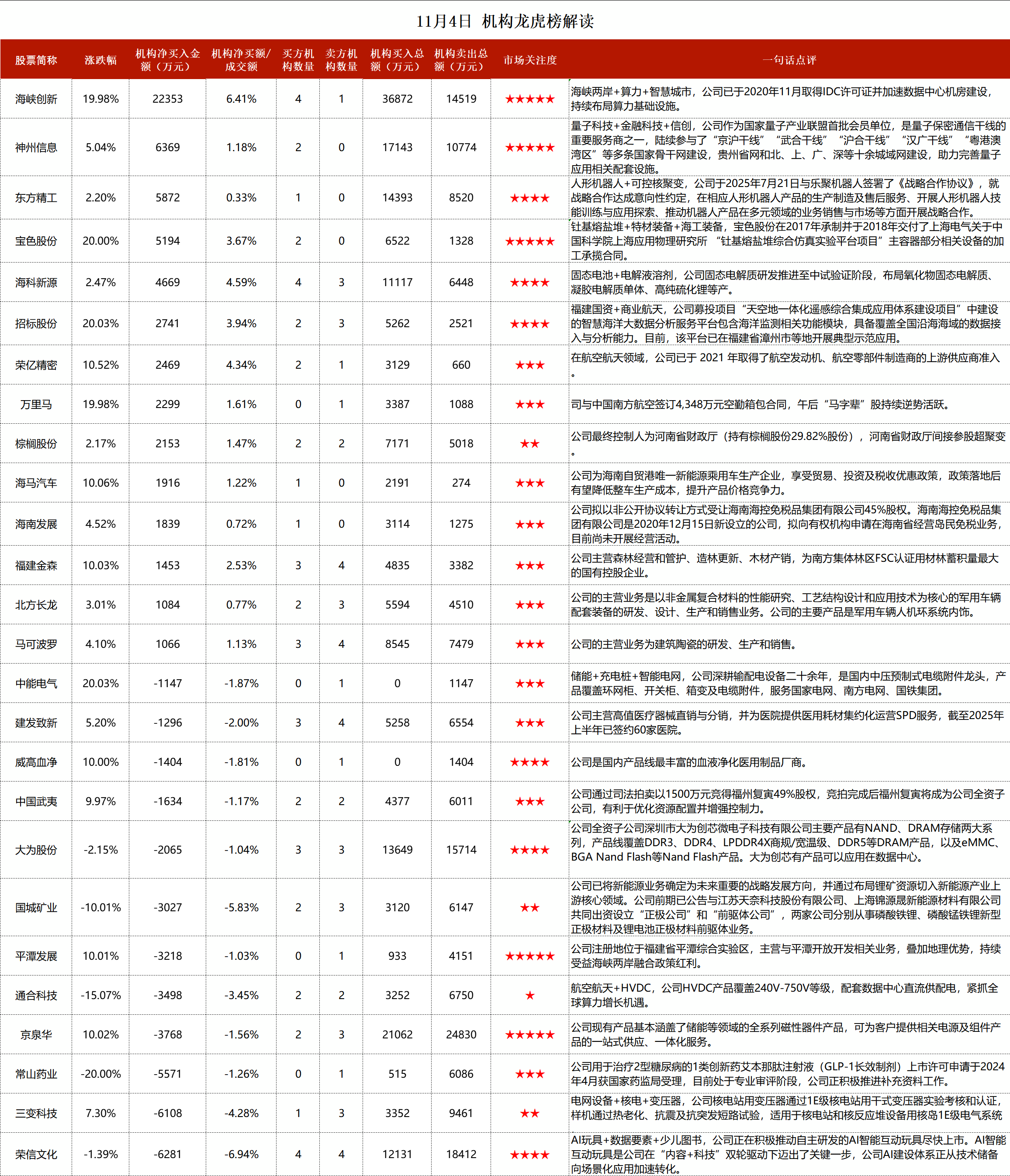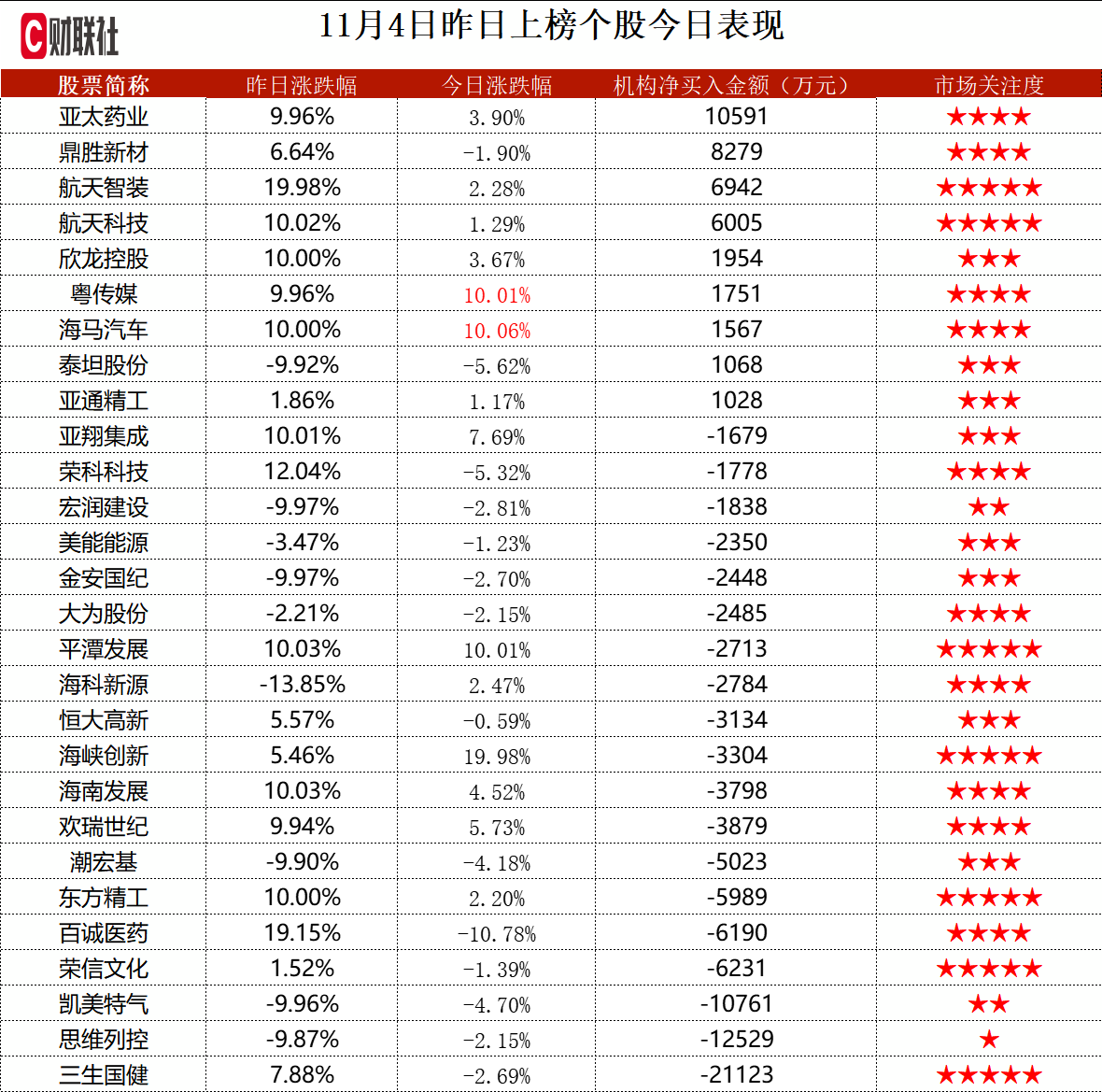 今日机构参与度较上周五有所降低,净买卖额超1000万元个股共28只,净买入9只,净卖出19只,其中净买入亚太药业1.05亿、鼎盛新材8279万、航天智装6942万,净卖出三生国健2.11亿、思维列控1.25亿、凯美特气1.07亿。