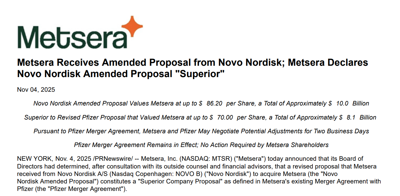 美国生物技术公司美特塞拉(Metsera)发布公告称,辉瑞和诺和诺德均提高了收购价格,但诺和诺德的报价依然更优。声明称,辉瑞还有两个工作日的时间来协商报价,如果在此期限结束后美特塞拉董事会依然认为诺和诺德的报价更好,有权终止现有的并购协议。
