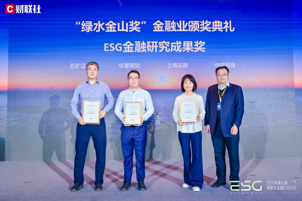 10月30日,由财联社主办的第五届金融ESG论坛在北京举行,论坛上“绿水金山”奖获奖名单正式揭晓,五矿证券荣获“ESG金融研究成果奖”。