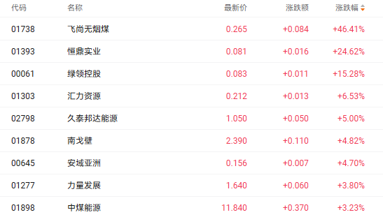 飞尚无烟煤(01738.HK)涨46.41%、南戈壁(01878.HK)涨4.82%、中煤能源(01898.HK)涨3.23%。