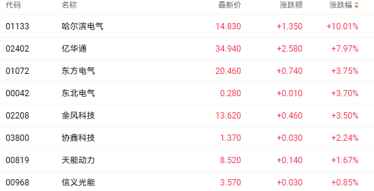 截至收盘,哈尔滨电气(01133.HK)涨10.01%、东方电气(02727.HK)涨3.75%、金风科技(02208.HK)涨3.50%。