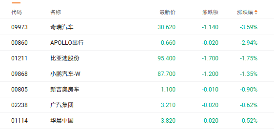 截至收盘,奇瑞汽车(09973.HK)跌3.59%、比亚迪股份(01211.HK)跌1.75%、小鹏汽车-W(09868.HK)跌1.35%。