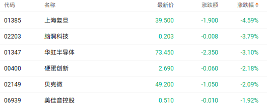 截至收盘,上海复旦(01385.HK)跌4.59%、华虹半导体(01347.HK)跌3.10%、英诺赛科(02577.HK)跌1.59%。