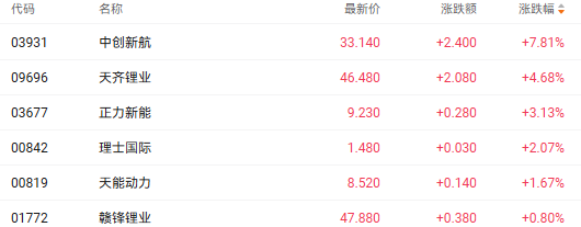 截至收盘,中创新航(03931.HK)涨7.81%、天齐锂业(09696.HK)涨4.68%、赣锋锂业(01772.HK)涨0.80%。