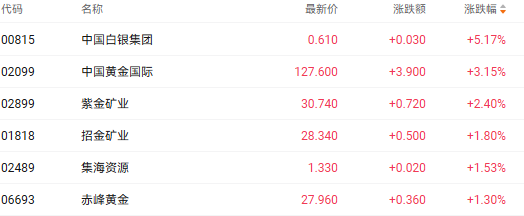 截至收盘,中国白银集团(00815.HK)涨5.17%、中国黄金集团(02099.HK)涨3.15%、招金矿业(01818.HK)涨1.80%。