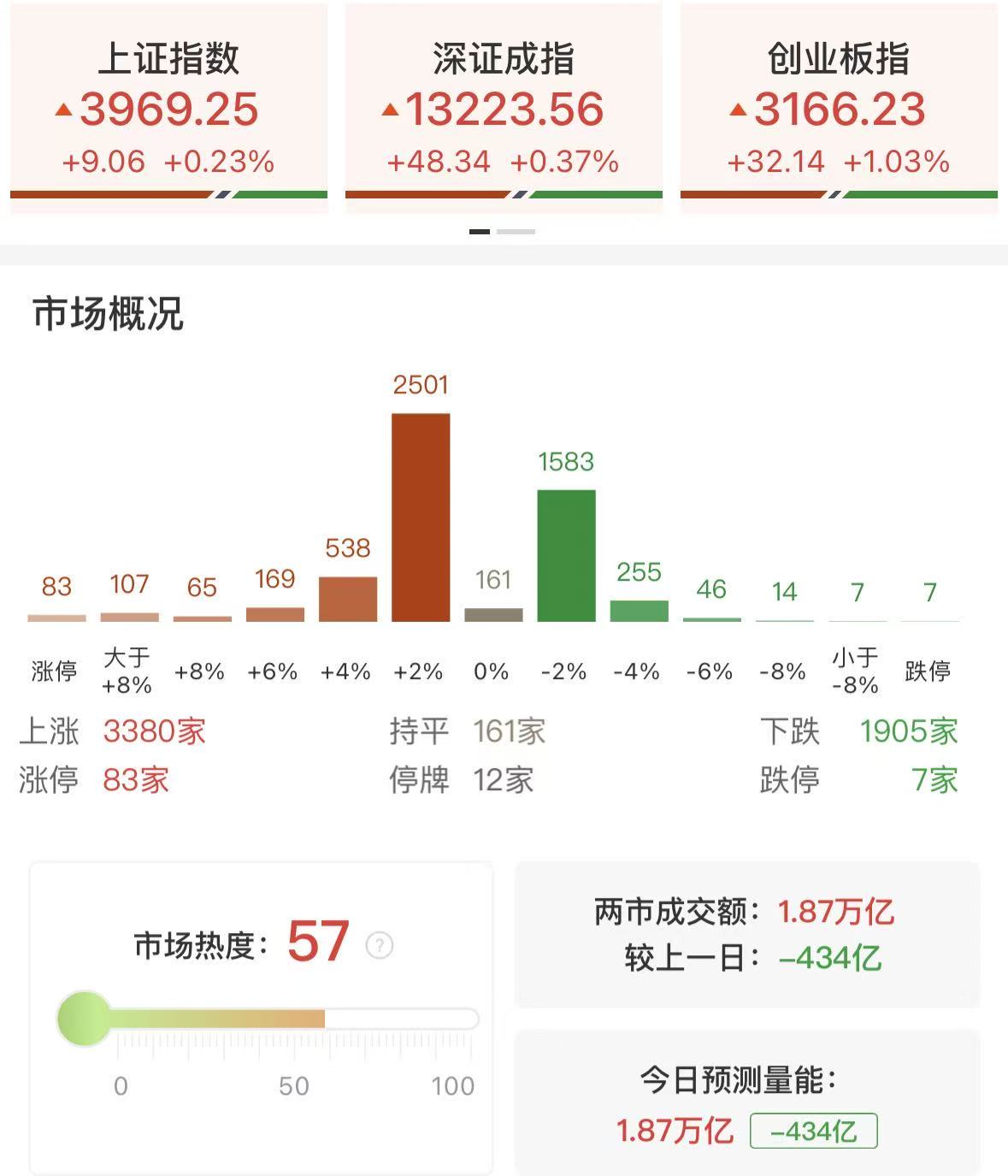 财联社11月5日讯,市场全天震荡反弹,三大指数低开高走,全线收红。沪深两市成交额1.87万亿,较上一个交易日缩量453亿。盘面上,市场热点轮番活跃,全市场近3400只个股上涨。从板块来看,电网设备板块持续爆发,京泉华3连板,摩恩电气、中能电气、神马电力2连板,特变电工等近20股涨停。海南板块再度走强,海马汽车等多股涨停。泛消费概念股集体走强,凯撒旅业、安记食品等多股涨停。储能板块率先走强,通润装备涨停创趋势新高,阿特斯20cm涨停。下跌方面,量子科技概念股调整,科大国创、格尔软件走弱。截至收盘,沪指涨0.23%,深成指涨0.37%,创业板指涨1.03%。