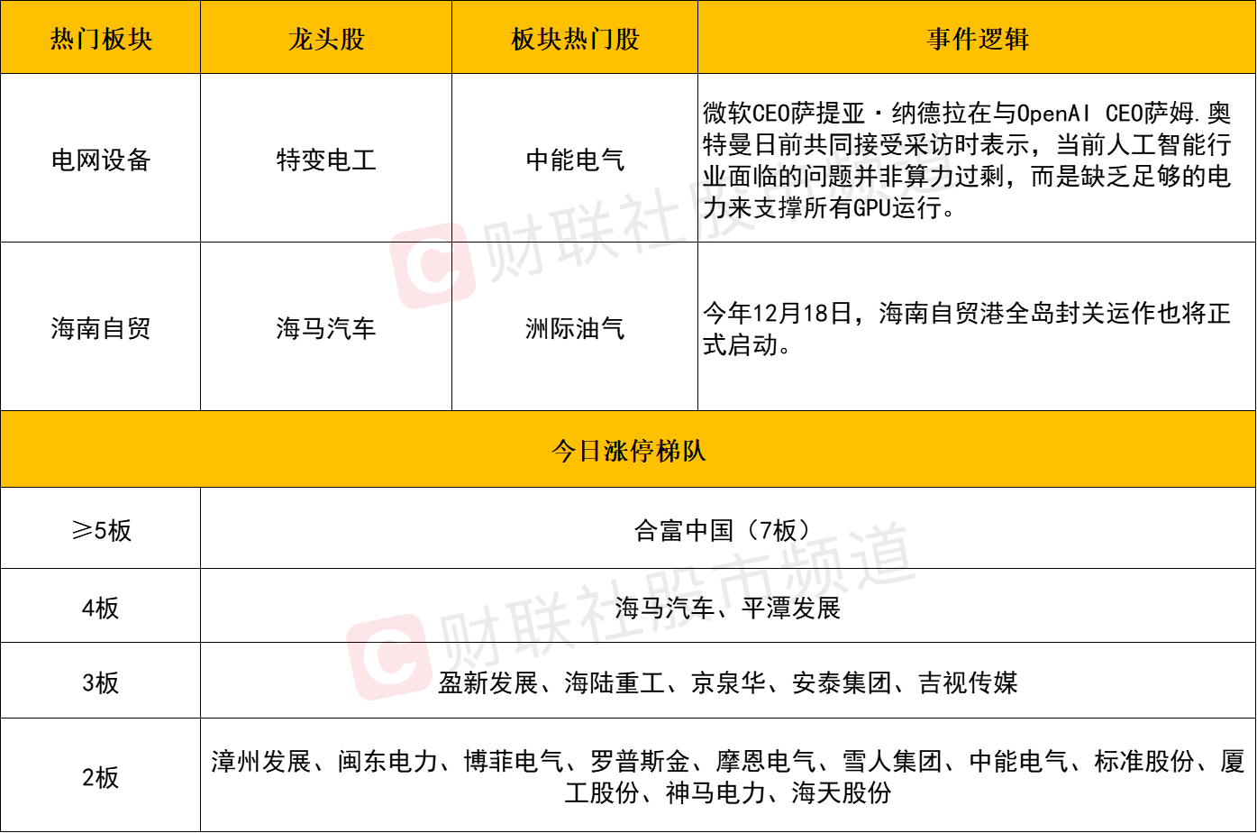 另一方面,“地图炒作”仍在延续,今日海南自贸区概念再度走强,海马汽车4连板、洲际油气、海峡股份等多股同样涨停。福建本地股方向持续活跃,除人气核心平潭发展以外、漳州发展、闽东电力、罗普斯金等同样斩获2连板。再结合电网设备与储能等时下热点方向,只要前排核心标没有转弱,资金仍有望围绕着上述热门赛道寻找一些低位补涨机会。