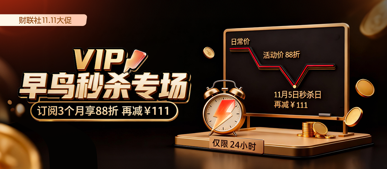 11月5日00:00-24:00,财联社VIP推出11.5早鸟秒杀——订阅任意10款VIP资讯3个月,在活动折扣(88折)的基础上再减111元,用户能以更低成本配置“信息宝典”,应对年末投研关键期。