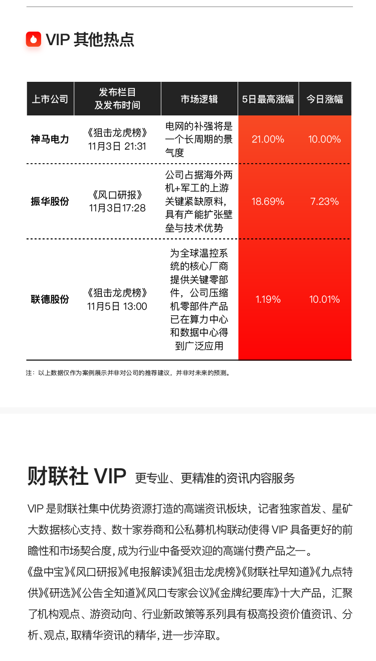 注:财联社VIP为内容资讯产品,并非投资建议。以下内容仅为资讯价值展示非对相关公司的推荐建议,非未来走势预测。投资有风险,入市需谨慎。
