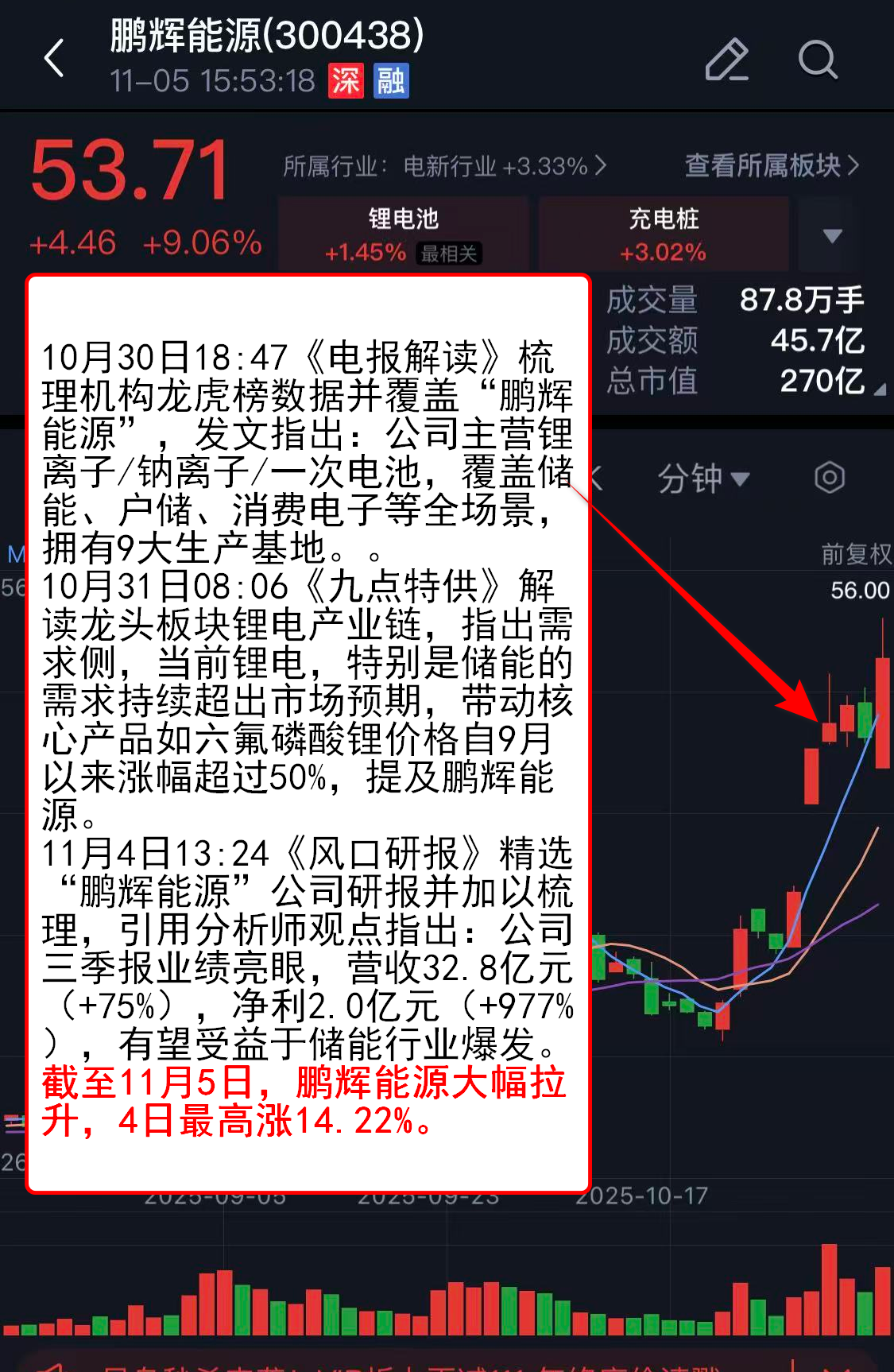 截至11月5日,鹏辉能源大幅拉升,4日最高涨14.22%。