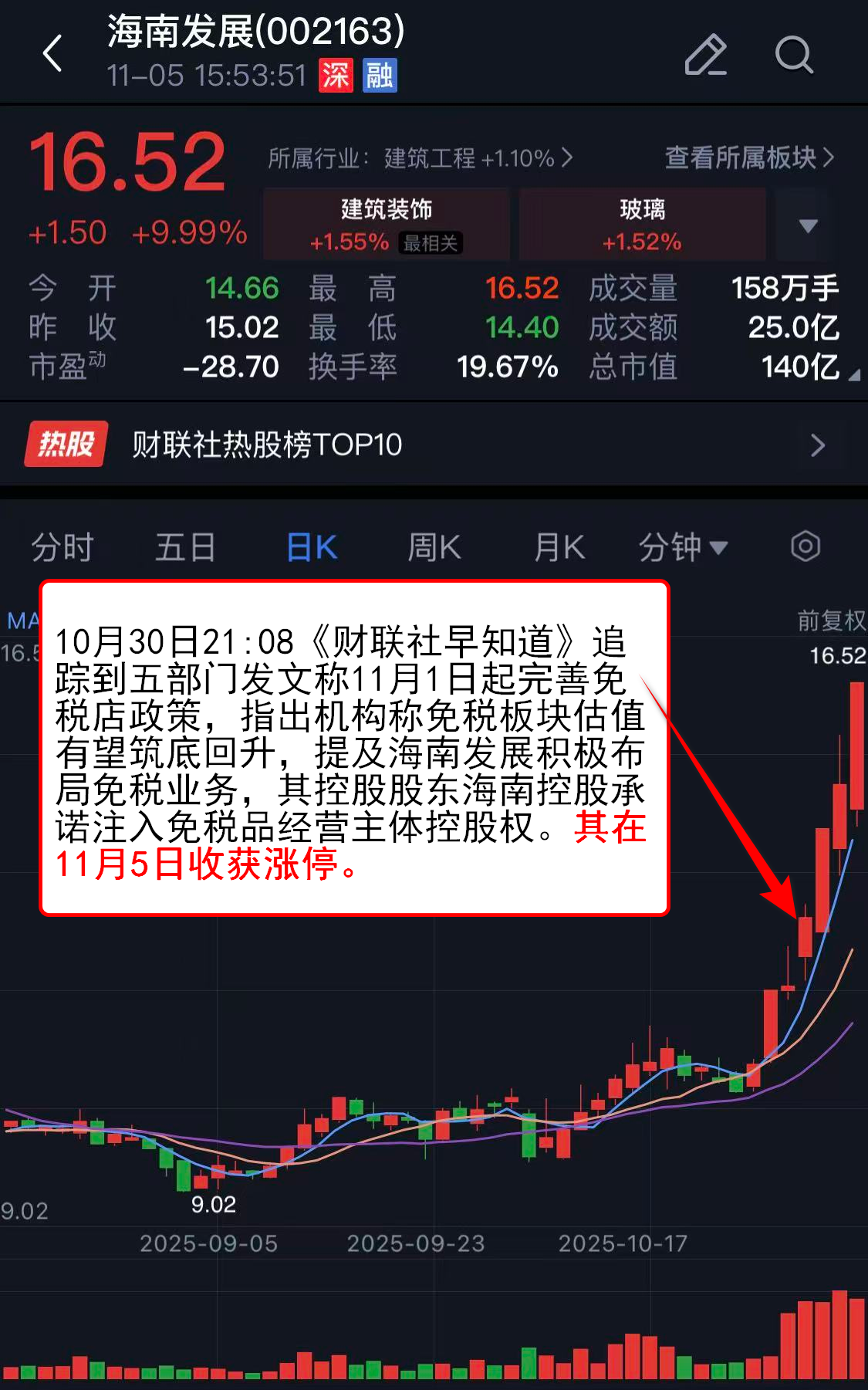 10月30日21:08《财联社早知道》追踪到五部门发文称11月1日起完善免税店政策,指出机构称免税板块估值有望筑底回升,提及海南发展积极布局免税业务,其控股股东海南控股承诺注入免税品经营主体控股权。其在11月5日收获涨停。
