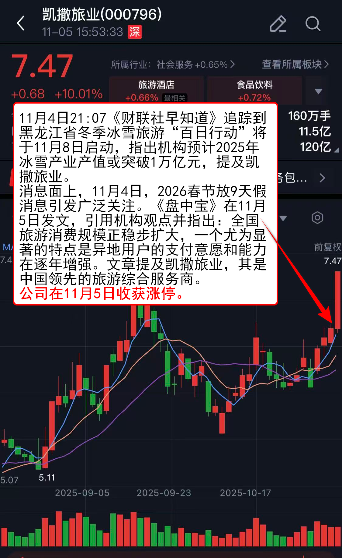 消息面上,11月4日,2026春节放9天假消息引发广泛关注。《盘中宝》在11月5日发文,引用机构观点并指出:全国旅游消费规模正稳步扩大,一个尤为显著的特点是异地用户的支付意愿和能力在逐年增强。文章提及凯撒旅业,其是中国领先的旅游综合服务商。