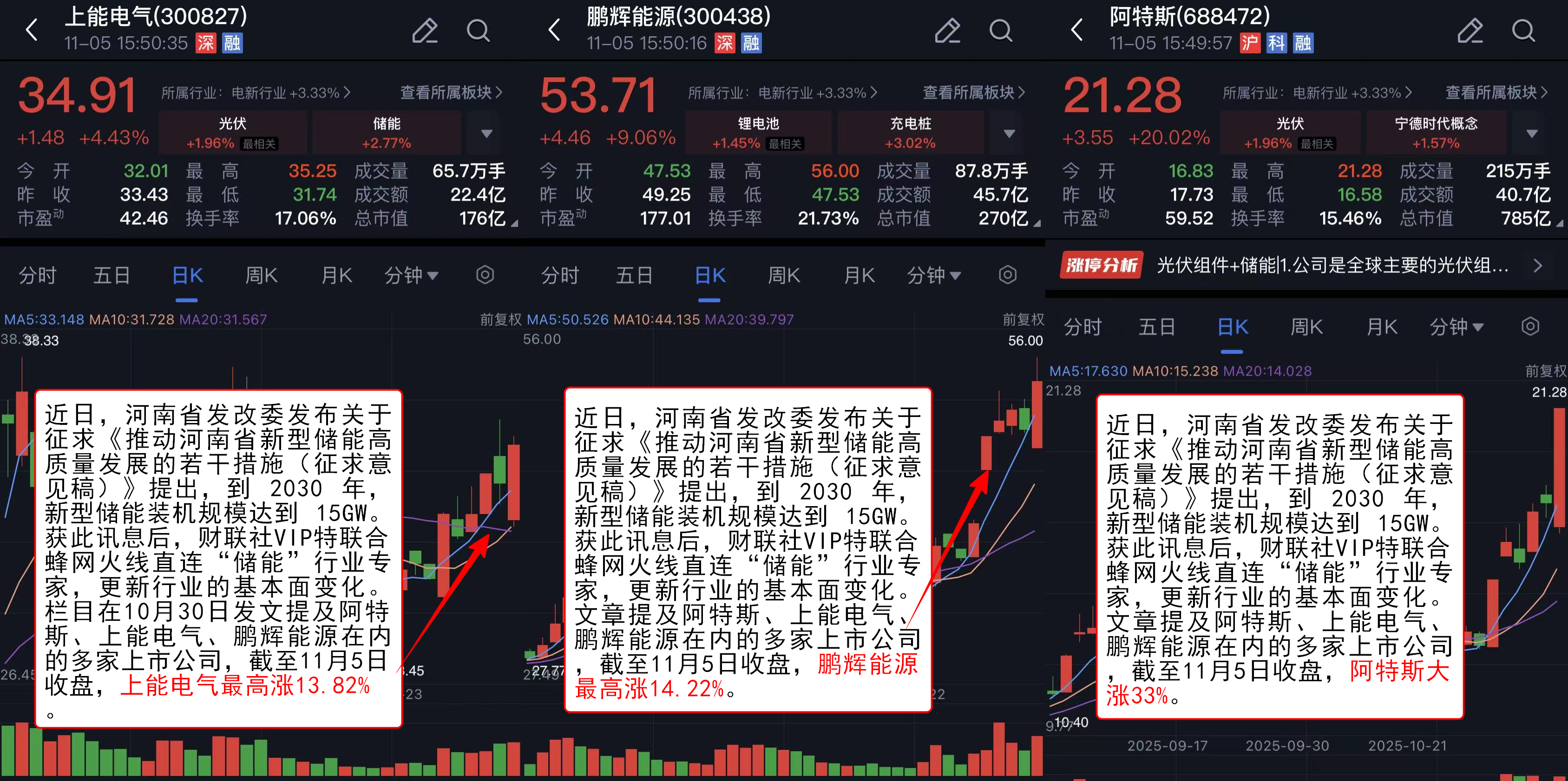 近日,河南省发改委发布关于征求《推动河南省新型储能高质量发展的若干措施(征求意见稿)》提出,到 2030 年,新型储能装机规模达到 15GW。获此讯息后,财联社VIP特联合蜂网火线直连“储能”行业专家,更新行业的基本面变化。栏目在10月30日发文提及阿特斯、上能电气、鹏辉能源在内的多家上市公司。截至11月5日收盘,其中阿特斯大涨33%,鹏辉能源最高涨14.22%,上能电气最高涨13.82%。