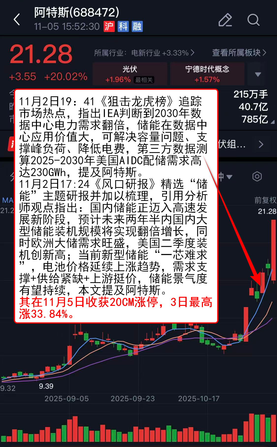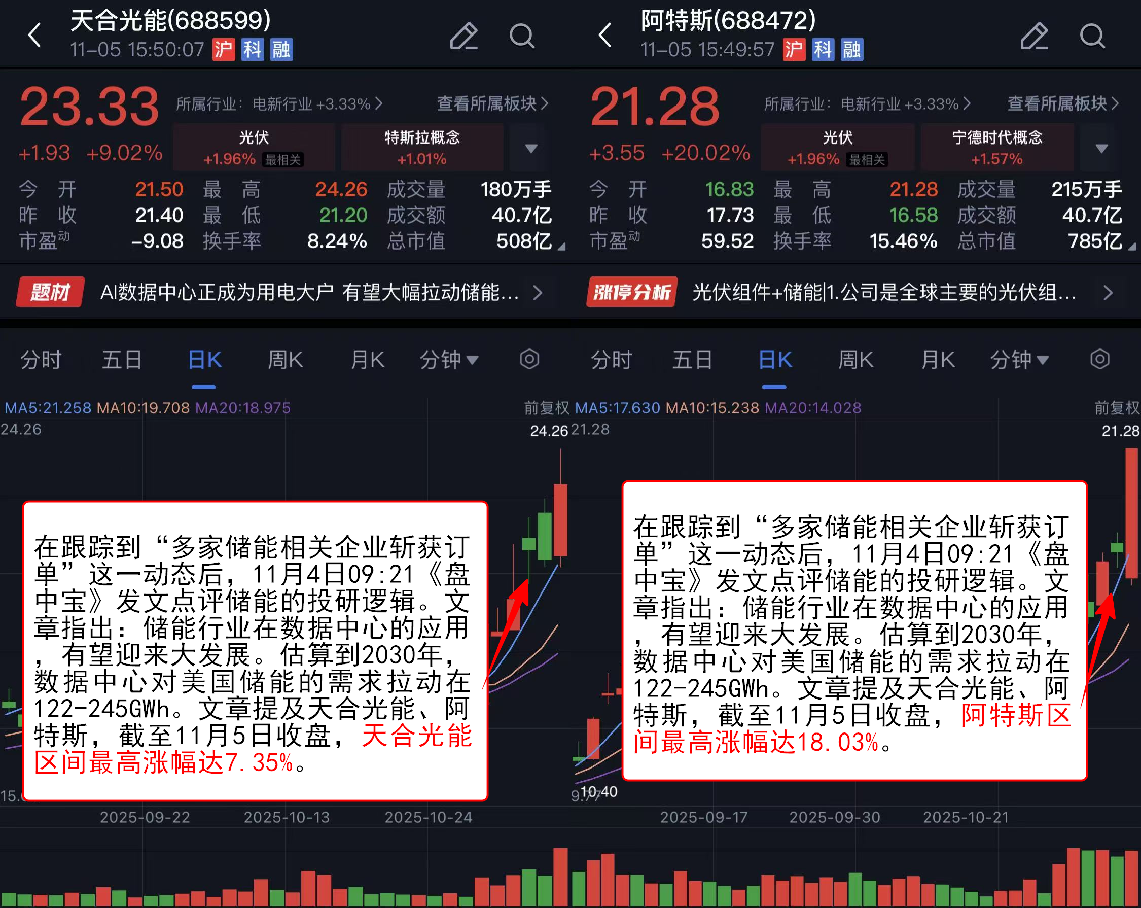 在跟踪到“多家储能相关企业斩获订单”这一动态后,11月4日09:21《盘中宝》发文点评储能的投研逻辑。文章指出:储能行业在数据中心的应用,有望迎来大发展。估算到2030年,数据中心对美国储能的需求拉动在122-245GWh。文章提及天合光能、阿特斯,截至11月5日收盘,阿特斯区间最高涨幅达18.03%,天合光能区间最高涨幅达7.35%。