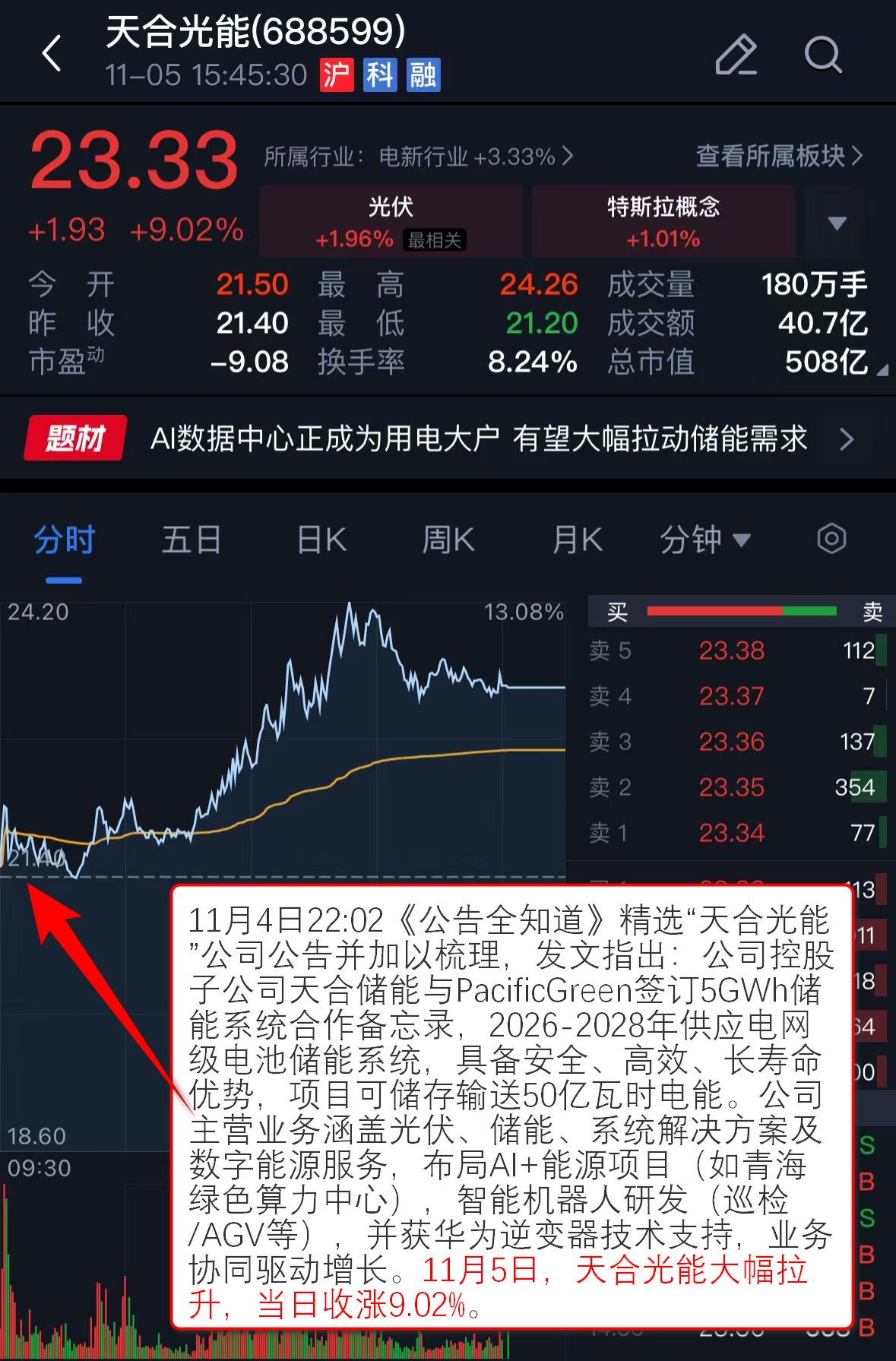 11月4日22:02《公告全知道》精选“天合光能”公司公告并加以梳理,发文指出:公司控股子公司天合储能与PacificGreen签订5GWh储能系统合作备忘录,2026-2028年供应电网级电池储能系统,具备安全、高效、长寿命优势,项目可储存输送50亿瓦时电能。公司主营业务涵盖光伏、储能、系统解决方案及数字能源服务,布局AI+能源项目(如青海绿色算力中心),智能机器人研发(巡检/AGV等),并获华为逆变器技术支持,业务协同驱动增长。11月5日,天合光能大幅拉升,当日收涨9.02%。
