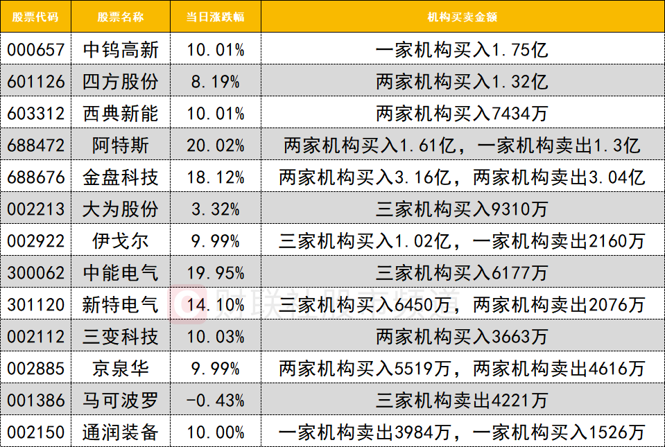 机构博弈多只电网设备股,其中西典新能获两家机构买入7434万。金盘科技获两家机构买入3.16亿,同时遭两家机构卖出3.04亿。新特电气获三家机构买入6450万,同时遭两家机构卖出2076万。京泉华获两家机构买入5519万,同时遭两家机构卖出4616万。